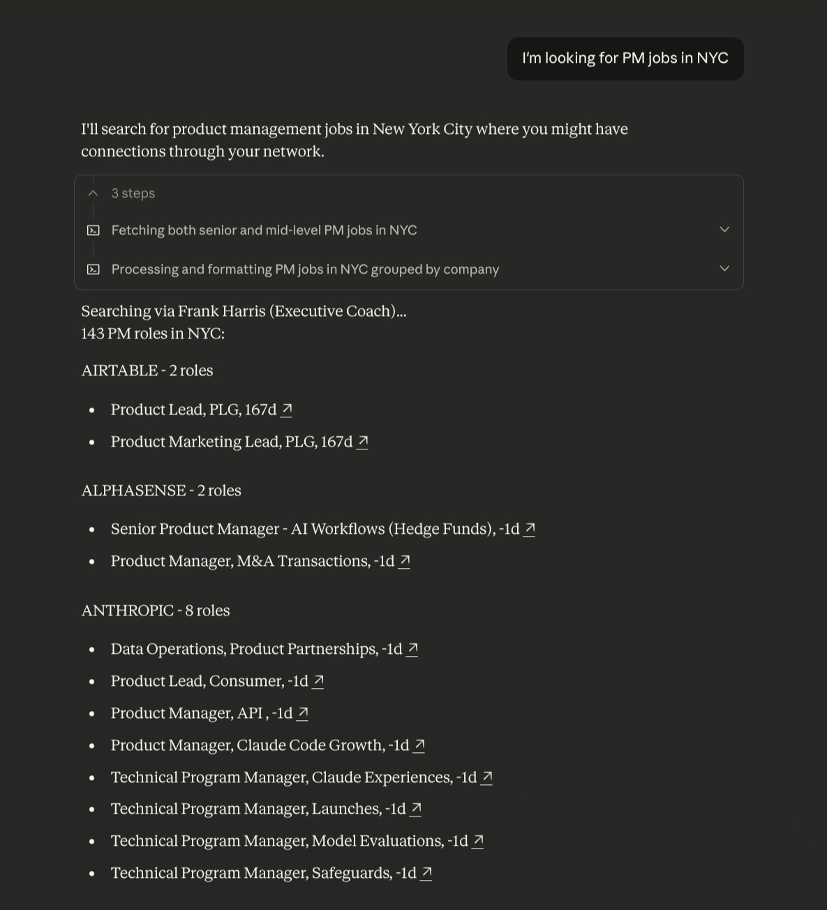 If we don't know each other that well — or we do but you want to cast a wider net — I built a skill that searches job openings at companies where I have connections (nerd alert: I crawl hundreds of company job boards daily and marry them with my connections). These are people I can reach out to, even if some are LinkedIn contacts I haven't talked to in years.