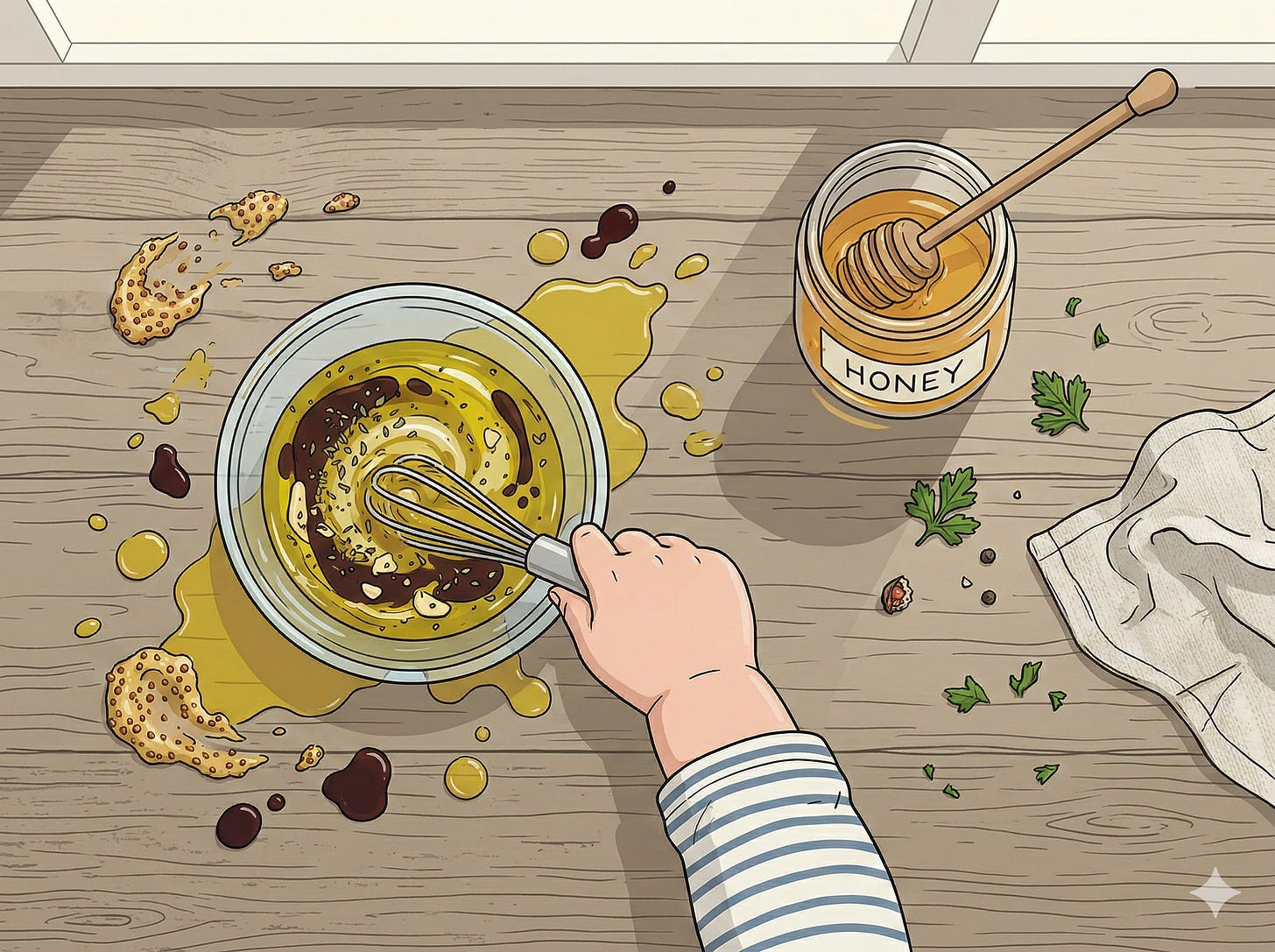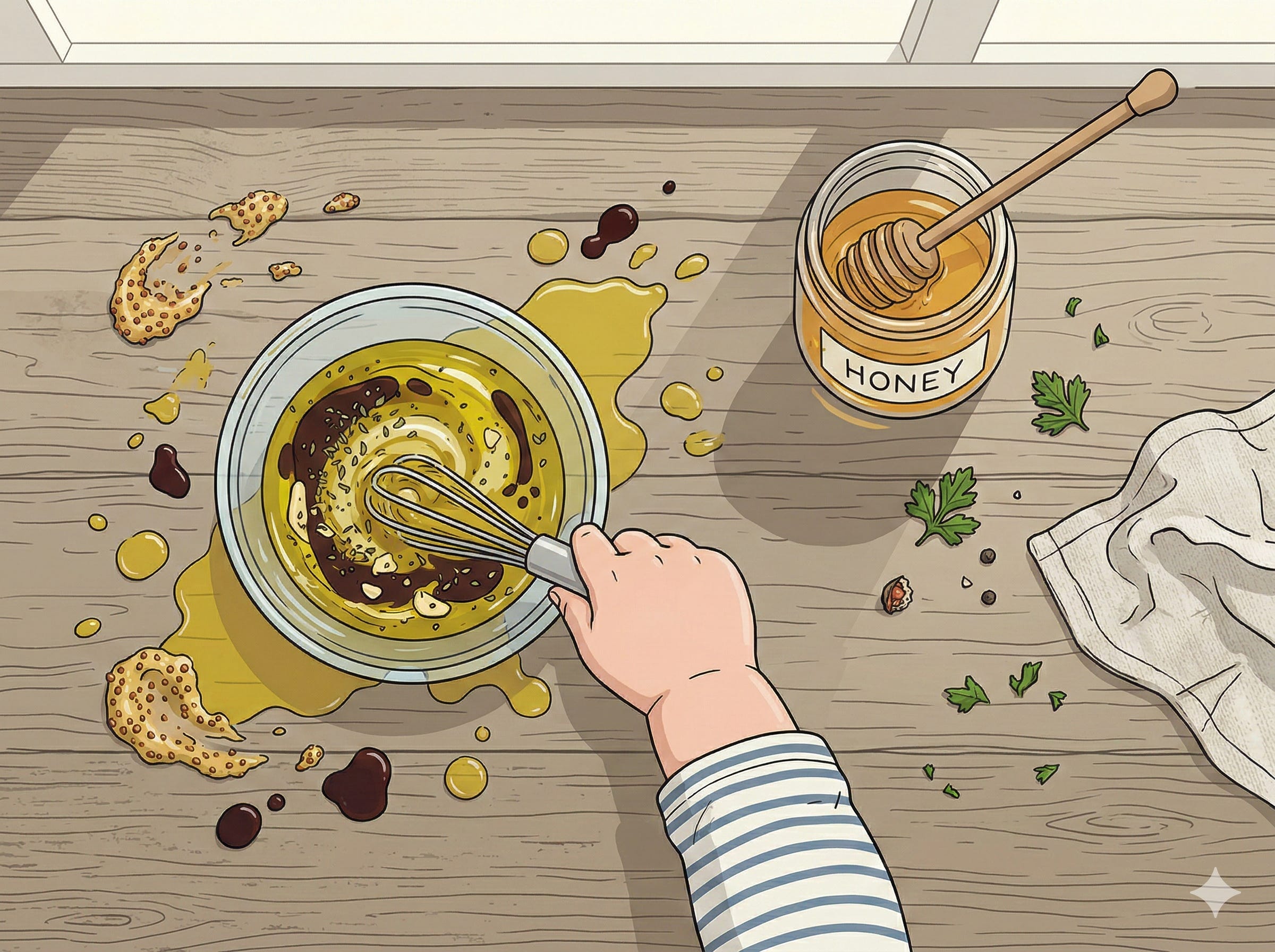 My daughter eventually got the vinaigrette mixed. It was lumpy and oversalted, and she insisted on tasting it straight from the bowl with a spoon. She made a face, thought about it, and said, “More honey.”